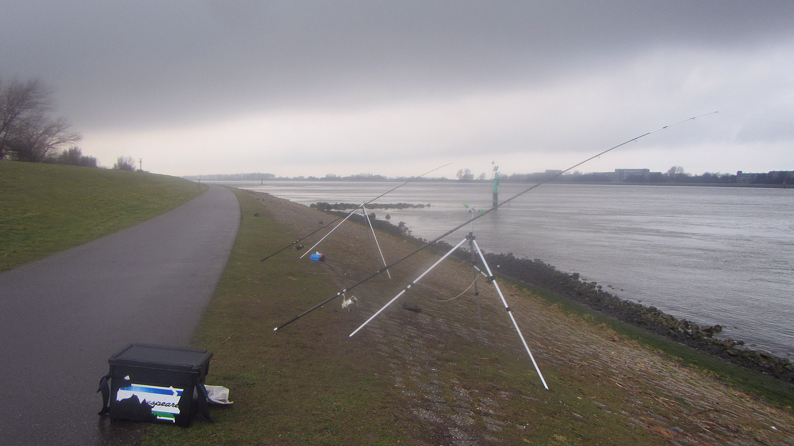 Na een klein uurtje hebben we geen enkele actie op de hengels gehad. De eerste spetters van de inkomende grote plak regen, die we al van de buienradar kennen, beginnen te vallen. Even later besluiten we te kijken of we een andere plek kunnen vinden voordat we bij de Waterweg zullen starten met het vangen van gullen.