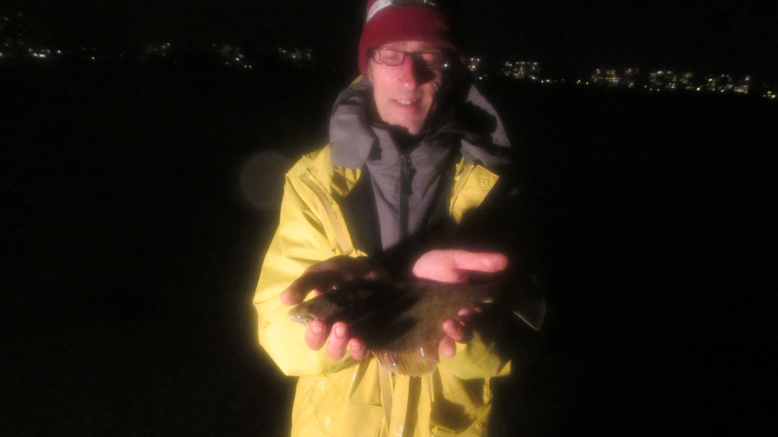 Eelco zet de Colemanlamp klaar en we maken ons op voor het hoogtepunt van de dag: de schemering en afgaand water. Het is inmiddels donker en ben ik aan de beurt voor een mooie bot aan m’n 1/0 haak.