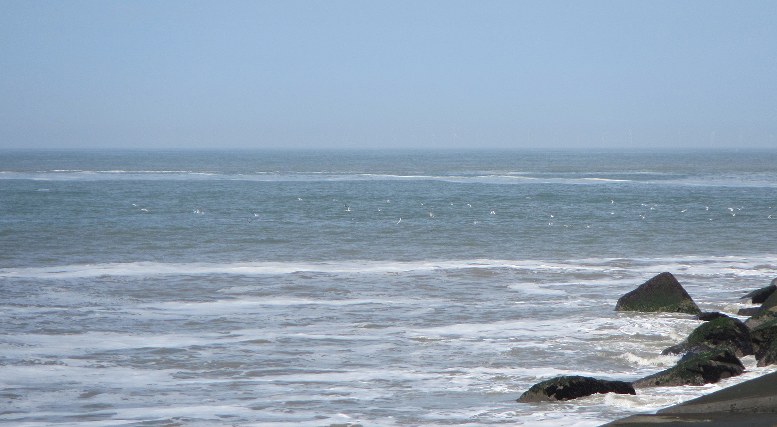 Er duikt van alles (sterns, meeuwen, visdiefjes) door elkaar op ‘iets’ in het bruine water, maar er is bijvoorbeeld geen springende vis te zien.
