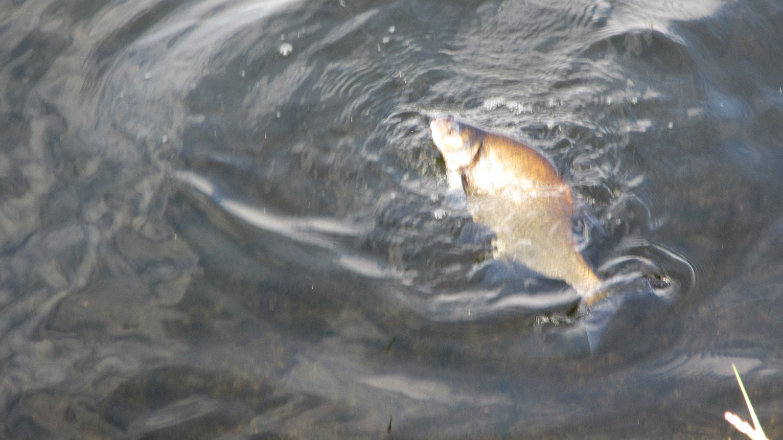 De school heeft zich niet laten verjagen en blijft rondhangen. Ik blijf kleine beetjes voer strooien als het even ‘rustig’ is. Een handje vlak onder de kant levert plots een hoop geplons op. Shit, boven op een paar vissen gegooid. Daar is lokaas niet voor bedoeld…