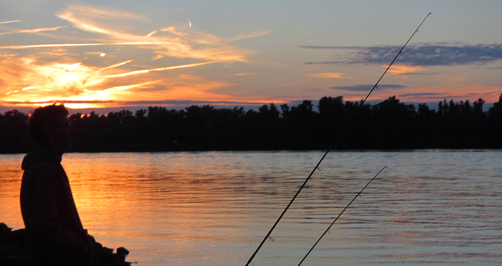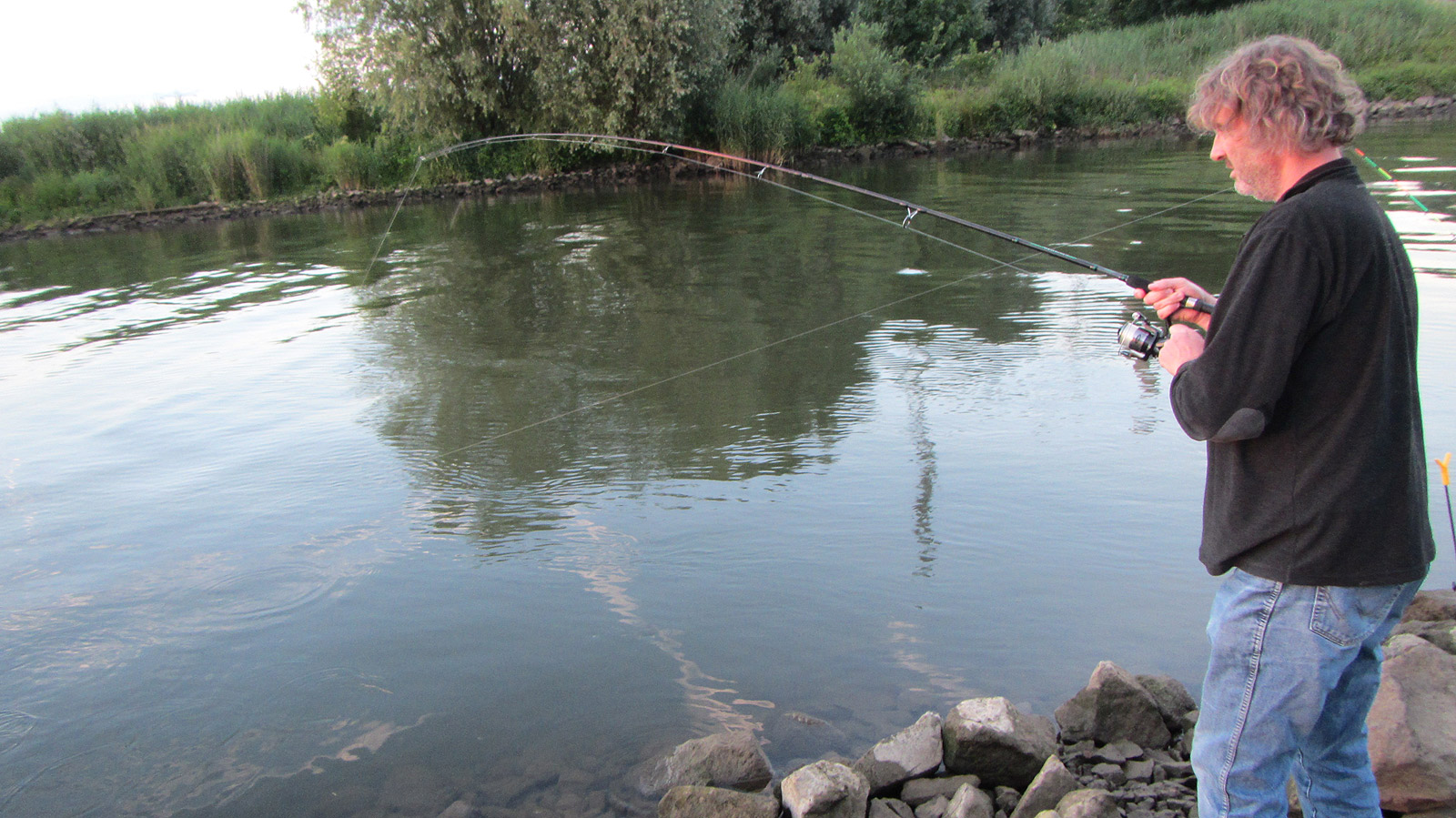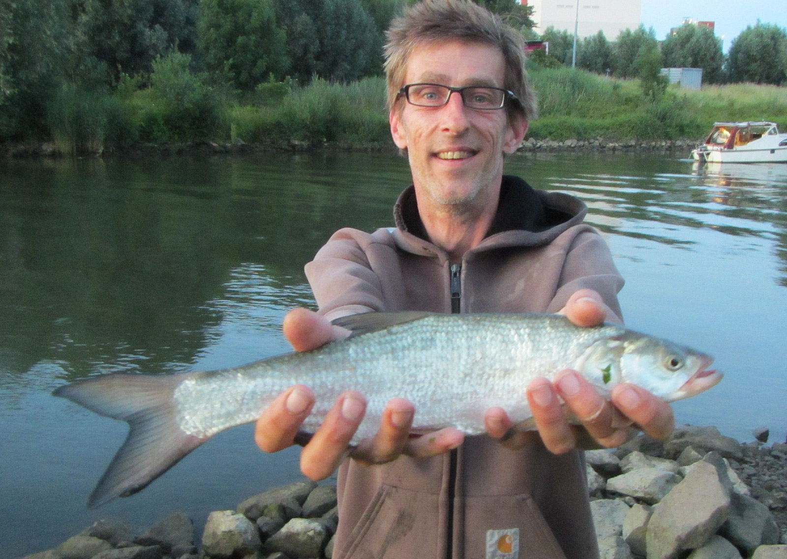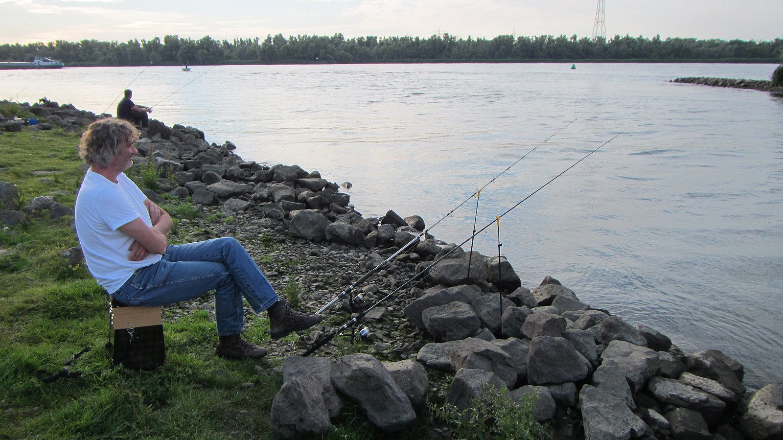 Het eerste uur vermaken we ons al babbelend, maar naarmate de schemer nadert, stijgt de activiteit op en onder het water. Een buurman vangt een snoekbaars. Er komen regelmatig bootjes met sportvissers langs. Een van hen zien we een meerval aan een shadje vangen.