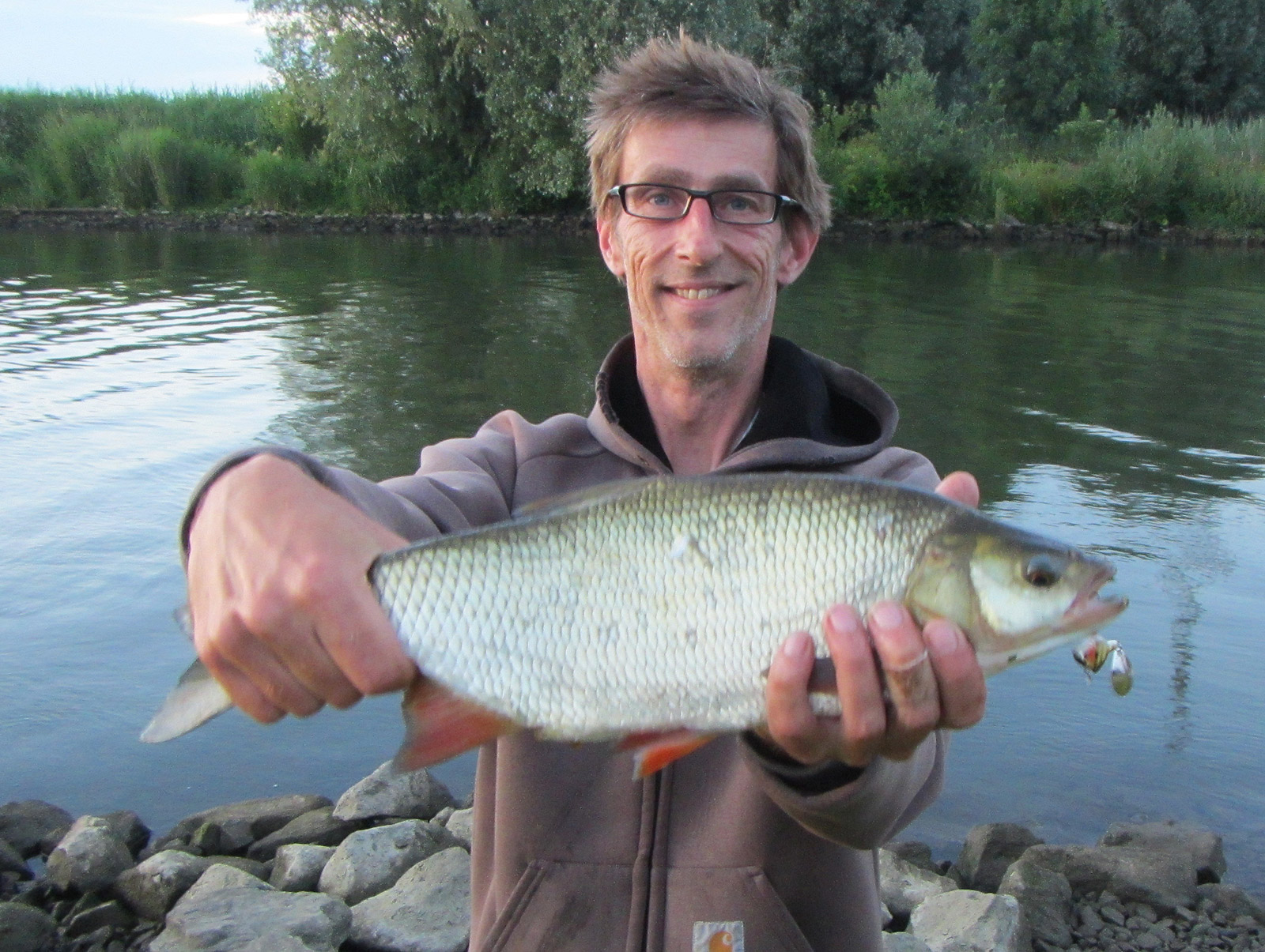 Dan begint bij ons de actie, het is rond half tien. De buren vertrekken en wij kunnen onze visstek wat uitbreiden. Aan de oppervlakte van het sneller stromende water beginnen zich roofbleien te laten zien. Jacques geeft tips welke plekjes af te werpen.