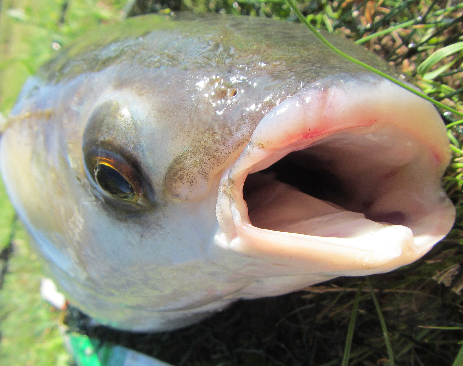 Verborgen achter het gras blijf ik stug kleine beetjes voer gooien en de nijlganzen op afstand houden. En dan ineens…een grote schim die gulzig door de broodwolkjes zwemt! En nog een… en nóg een: drie harders doen zich volop tegoed. Ze doen vandaag Hit and Run!