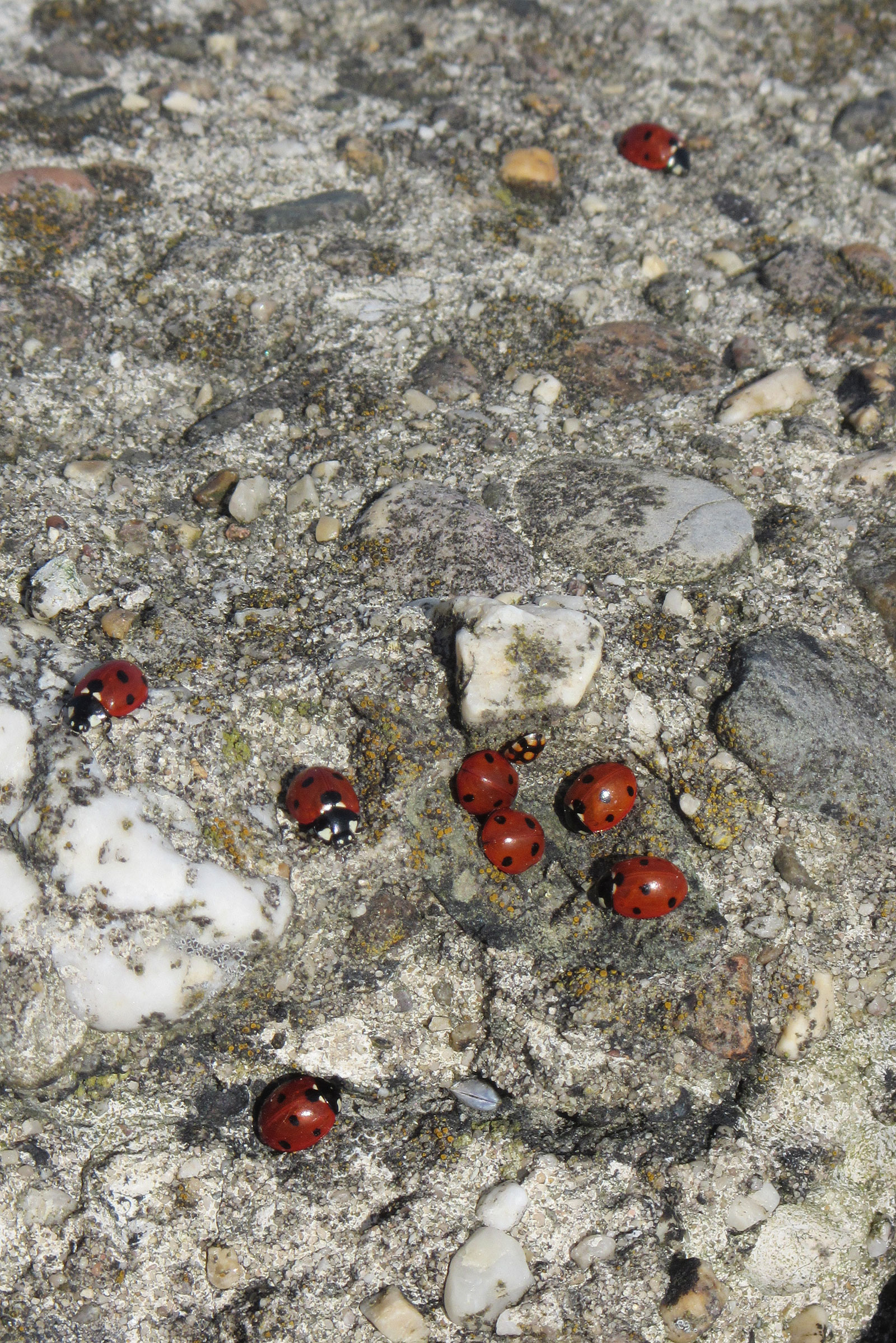 Een heel nest lieveheersbeestjes tussen de stenen.