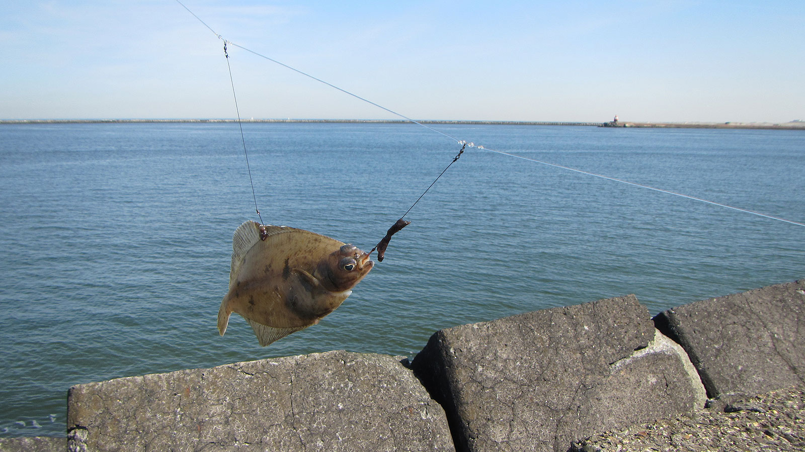 De grote truc blijkt vandaag het verslepen van het aas te zijn. Ik heb er niet aan gedacht, mede omdat ik iedere keer m’n loodje (160 gram zonder ankers) stevig uit de prut moet trekken. Dat sleept niet zo lekker, lijkt me. (De elleboog vond het tempo en de belasting vandaag trouwens prima vol te houden, maar deed niet aan extraatjes…). Een over de bodem waaiend ‘Portugeesje’ vind ik een mooi alternatief.