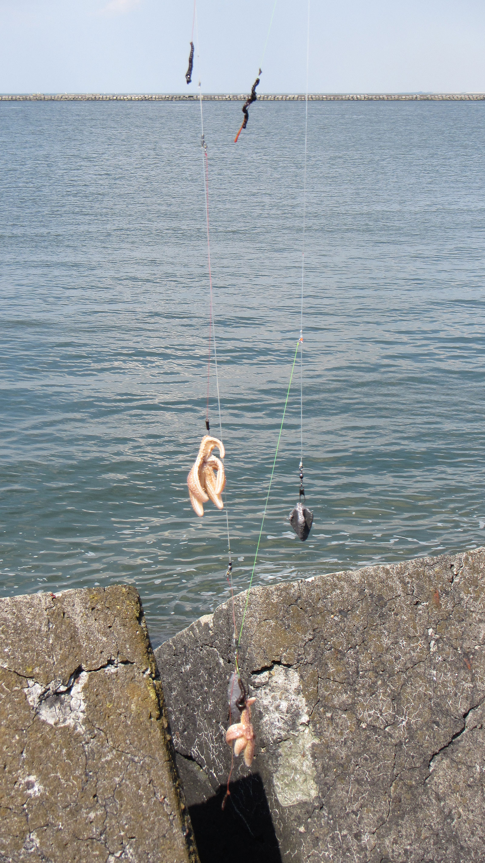 Het snel veel vangen lukt bij mij maar matig. Er komt mondjesmaat een bot of een schar op de kant. Alle vis vang ik aan zeepieren. De stukjes mesheft waar ik het de eerste worpen tevergeefs mee probeer, blijken dus geen geheim wapen. Ook samen met een piertje vang ik er niets mee.