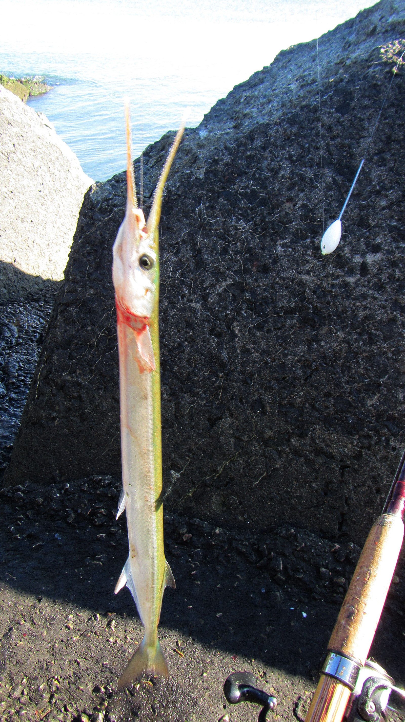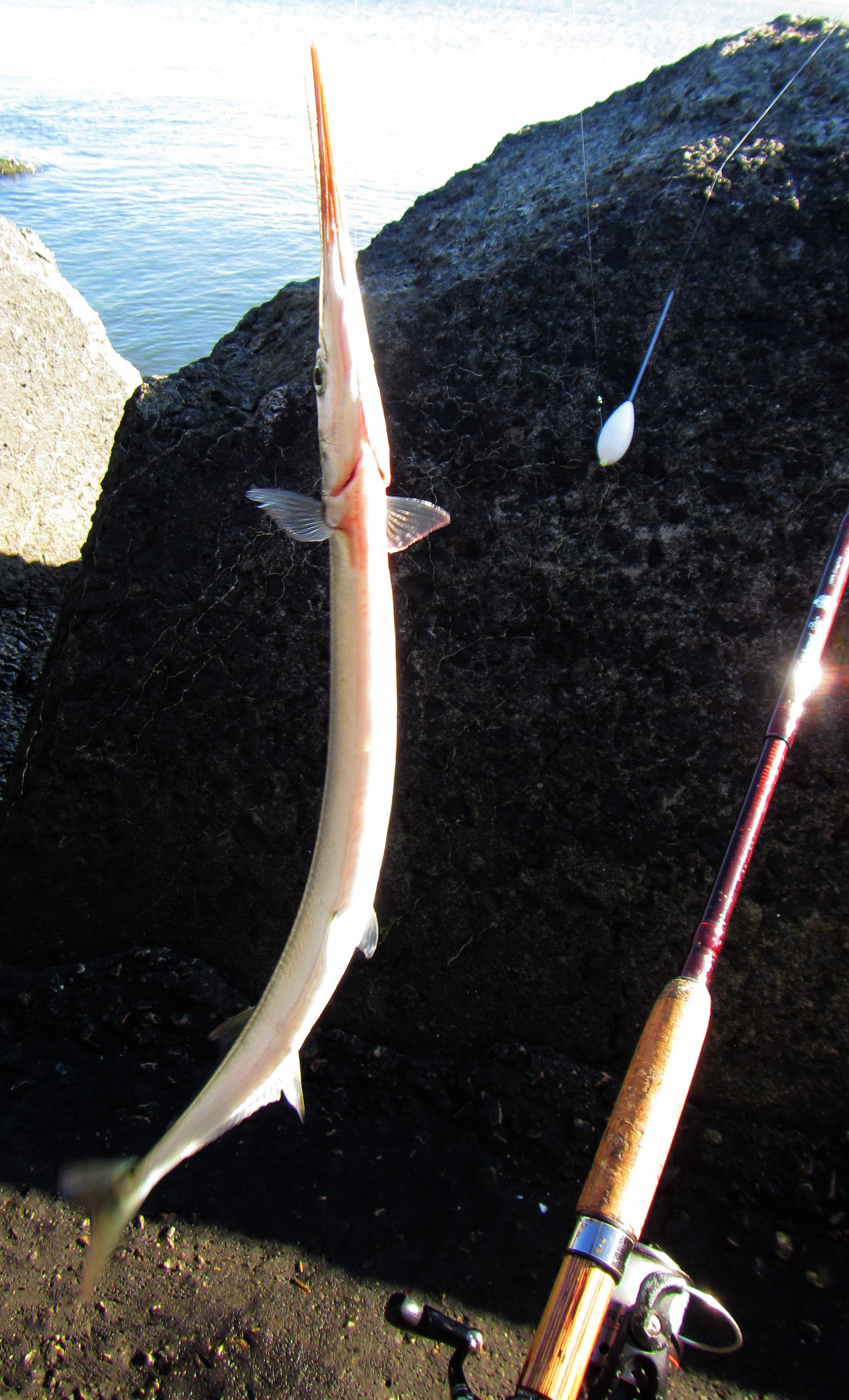Vandaag blijft(?) het droog, dus ik ga maar weer eens proberen ene geep aan de snavel te trekken, een makreeltje is ook zeer welkom. Het hoge water valt om 05:41 uur en het lukt me om 07:15 uur te starten met vissen. De wind zit weer in de zuidwesthoek en het water is weer wat helderder. Prima omstandigheden om aan de binnenkant van de Zuidpier aan het oppervlak te vissen.