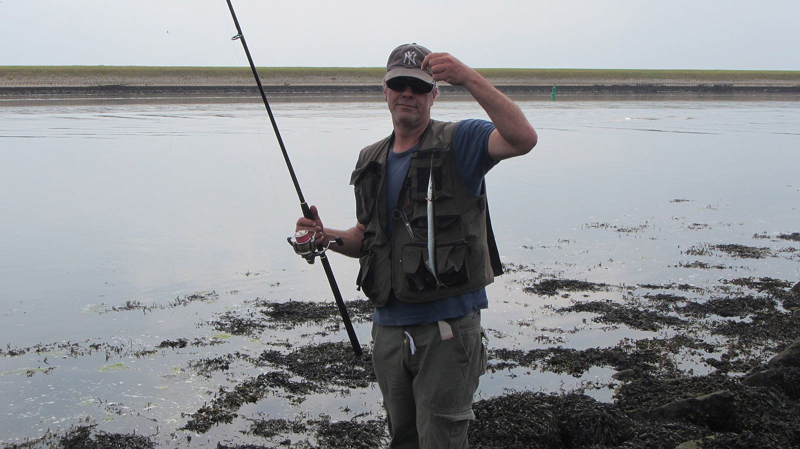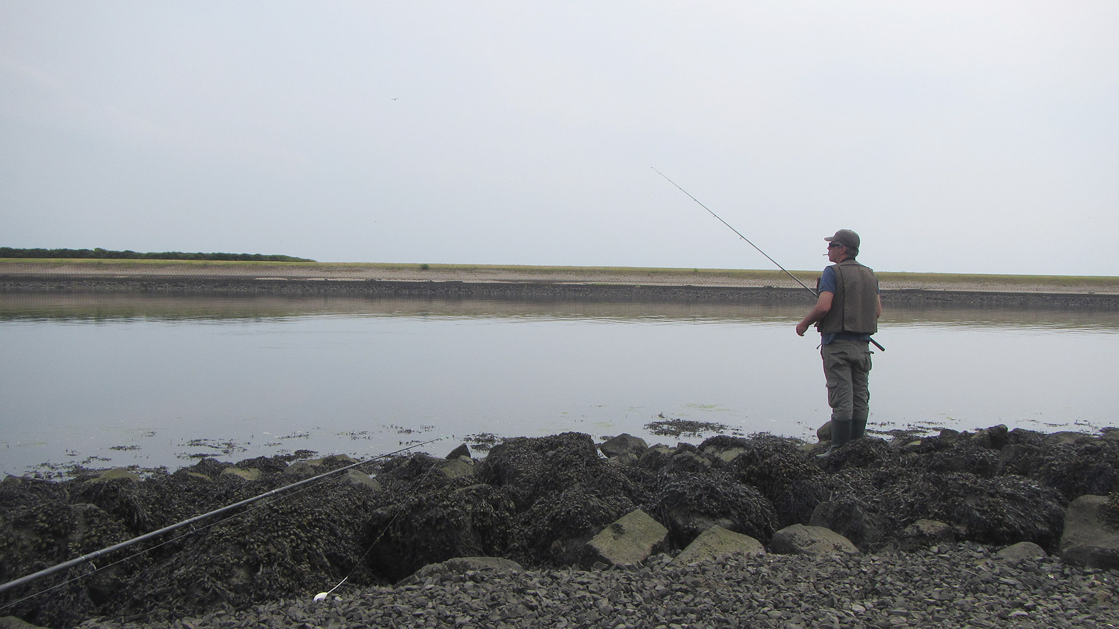De eerste beoogde stek, bij de camping van Stavenisse, valt gelijk af wegens toch ietsje te winderig en lastige toegankelijkheid van het water over de grote losse stenen vol met oesters en glibberig blaasjeswier. Iets meer een ‘hoogwaterstek’ dus.