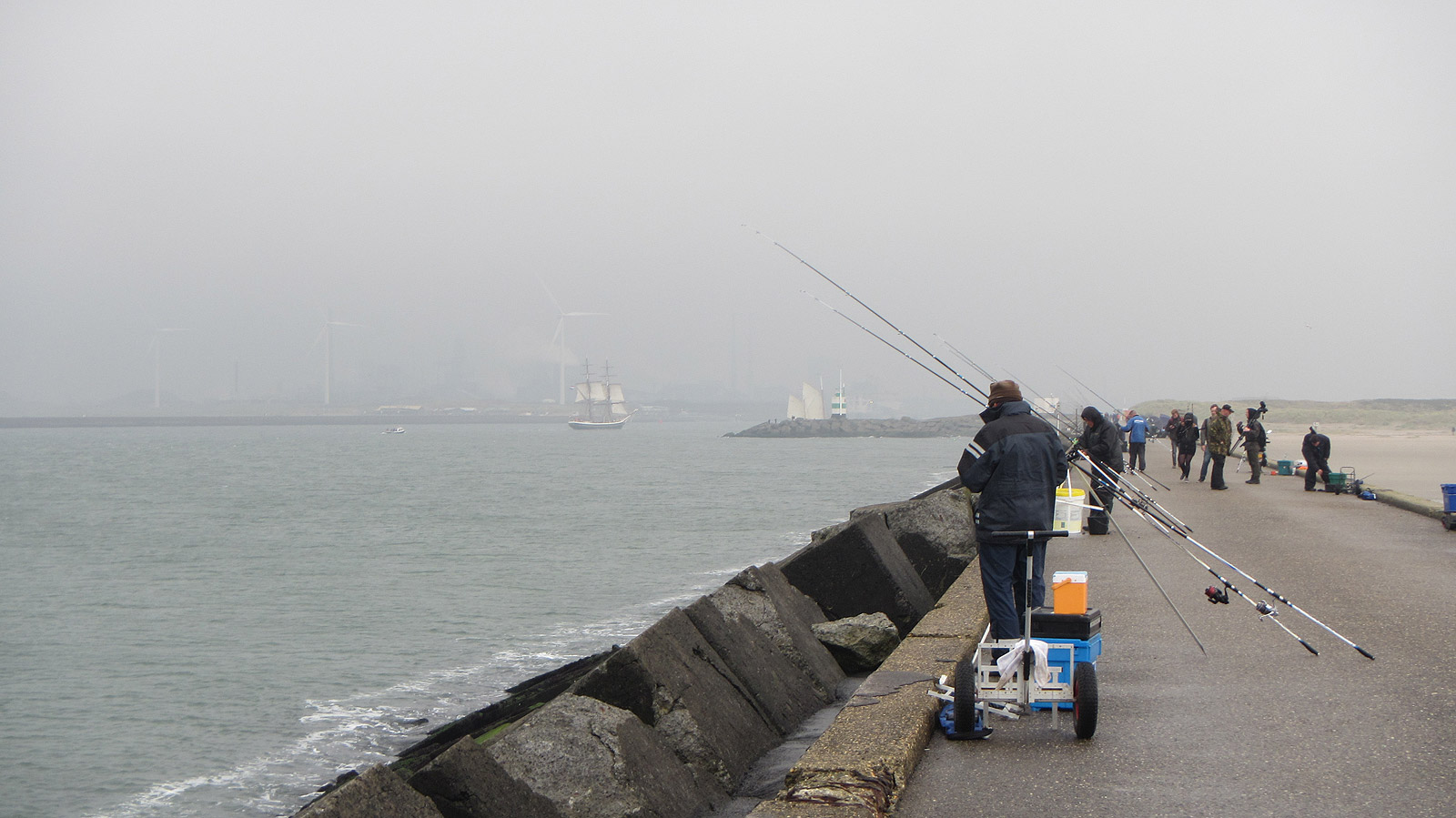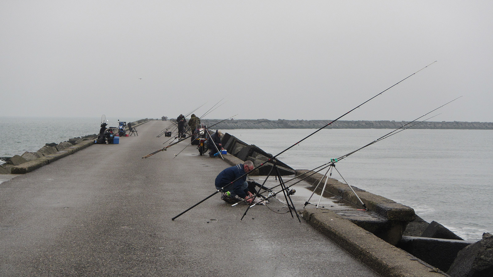 Het lot geeft me vandaag steknummertje 13, halverwege tussen het hek en de bocht van de Zuidpier. Dit stuk staat bekend als een plek waar de bodem is bedekt met een zachte sliblaag. Nadeel is dat het lood hier makkelijk in wegzakt, met medeneming van de beaasde haken. En dan vang je dus niet veel. De laatste wedstrijd van vorig seizoen stond ik ook ongeveer hier en heb toen flink wat gaatjes in de bodem achtergelaten zonder vis te vangen.