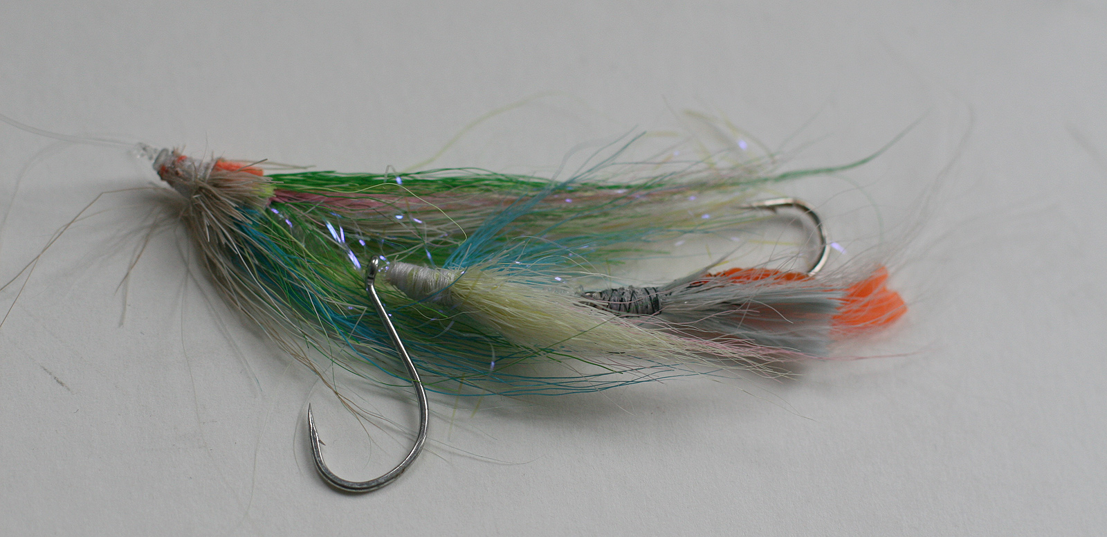 M’n streamer heeft een ‘upgrade’ gekregen. Twee wattenstaafjes met bucktail en wat glitter. Op de achterste haak zit wat bucktail en een klein oranja minishadje -een nog overgebleven zeebaarsexperimentje. De voorste haak zit los op de lijn geschoven en is een paar maatjes groter dan in de eerste versie. Ertussen kleine kraaltjes. Snoeken pakken de prooi graag zo dicht mogelijk bij de kop, dus vandaar de grote haak aldaar. Ook geen staaldraad, maar dik fluorcarbon, 70/00mm. De leader is 9.1kg Amnesia. Het geheel wordt gestuit door een knoopje.