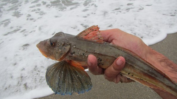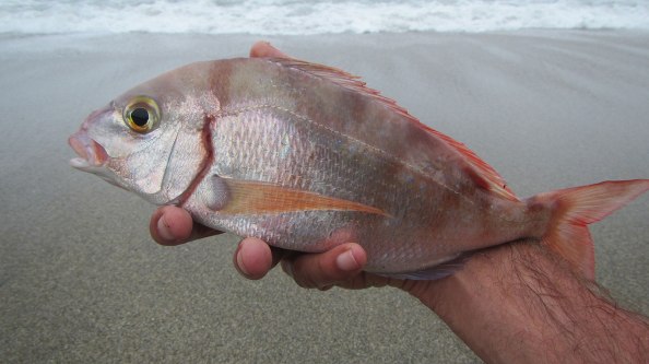 Een half uurtje later is de volgende aanbeet een onvervalste ‘slapvaller’; na één tik zakt de lijn al snel in de branding. Snel draaien om contact te maken. Een redelijk gewichtig iets wil niet graag mee komen. De slip hoeft er niet aan te pas te komen, de hengel mag af en toe toch lekker krom. Er komt alweer iets roods met de branding mee. Het is tot m’n verbazing een prachtige rode poon. Leuk hoor, zo’n unit vanaf het strand vangen. Bij ‘ons’ moet je er toch een aardig eindje de zee voor op…