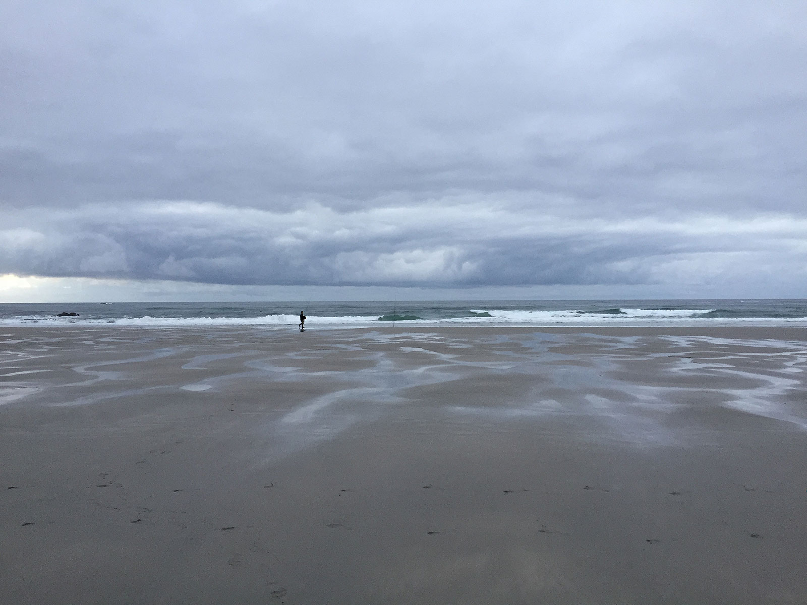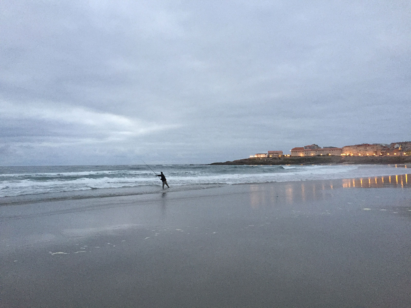 Het is er vol als het zonnetje schijnt en leeg bij bewolking of natte lucht. We maken één dag van beiden mee. Min of meer bij toeval ontdekken we op de bewolkte tweede dag een hengelsportzaak in het naburige stadje Navia en met een doosje Koreaantjes, kleine zagertjes uit het oosten (?), loop ik met afgaand water het lege strand op.