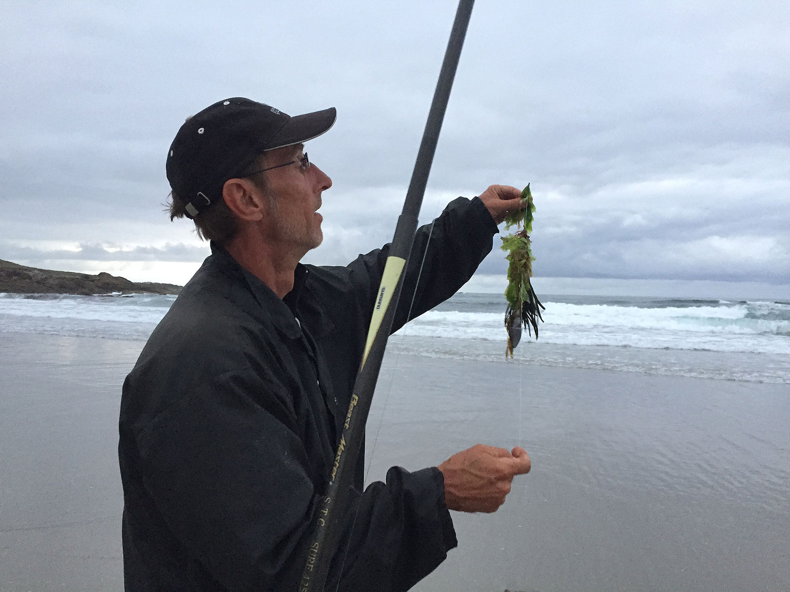 Ik heb er twee keer gevist. De eerste keer in de ochtend bij afgaand water met de spinhengel en een shad. Werpen in de branding en langzaam binnen draaien. Er staat verderop nog iemand te vissen, ook met kunstaas. Ondanks de weedless haak heb ik een flinke hoeveelheid ‘weed’ binnengedraaid. Die hoeveelheid is echter een peuleschilletje vergeleken met wat ik er de volgende avond met de strandhengel mag uittrekken.