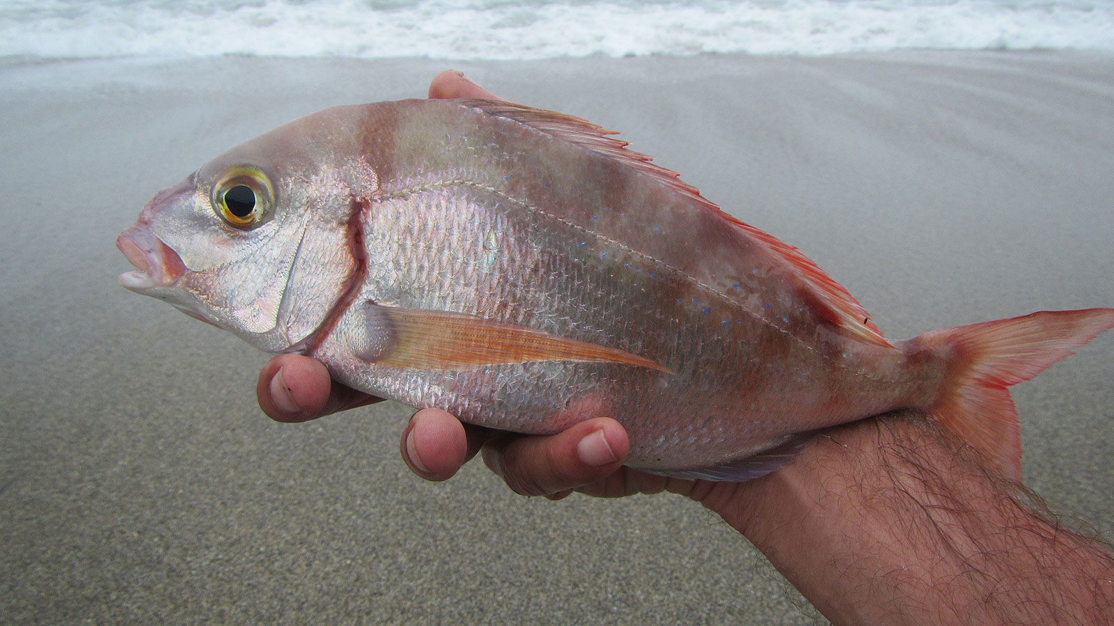 Al na de tweede worp krijgt de lijn een paar stevige rukken te verduren, venijnig gaat de hengeltop een paar keer hard in kromming. Het is een hele mooie aanbeet. De eerste seconden moet de slip een klein beetje bijstellen. Maar de rest van de dril is snel gewonnen. Het is een Pagellus Erythrinus, oftwel een gewone zeebrasem, maar wel een mooi maatje.