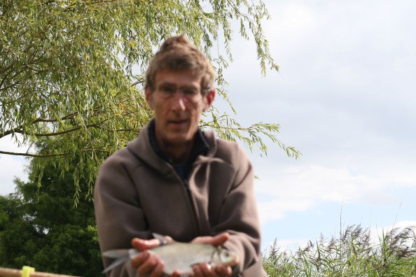 Hoewel Roel op de eerste avond al snel succesvol is met de vastloodhengel; een brasempje is aan de haak blijven hangen, is de vangst die avond en in het begin van de volgende ochtend -we starten even na 06:00 uur- niet denderend. Geen karper gaat voor een boilie en een enkel brasempje vergist zich in m’n wormen en maden soms aangevuld met een vlokje brood. Ook een rivierkreeftje wil dit wel hebben.