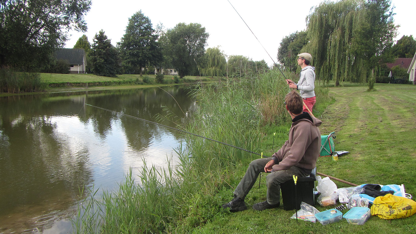 Roel is vooral karpervisser en vist met een vastloodhengel en een penhengel. Ik heb m’n feederhengel en een verzameling pakweg 20 jaar oude dobbers en pennen meegenomen. En wat spinhengels en een vliegenhengel -je kan ’t maar bij je hebben…-. De rest van het (klein)materiaal past makkelijk in m’n viskist. Hoofddoel blijft de visserij op karper en andere witvis, maar als er een snoek in de buurt is, kan deze ook worden bestookt.