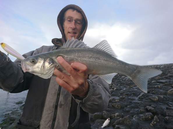 Terwijl er nog geen activiteit te zien is, heeft Joop al snel de eerste baars te pakken, een ruime vijftiger. Ze zijn er en zo moet het dus. Ik blijf werpen en de plug door het oppervlak trekken, wissel naar een ander type en Joop heeft inmiddels de tweede te pakken. Ook alweer een mooie. Ik moet toch een keer aan de beurt komen…