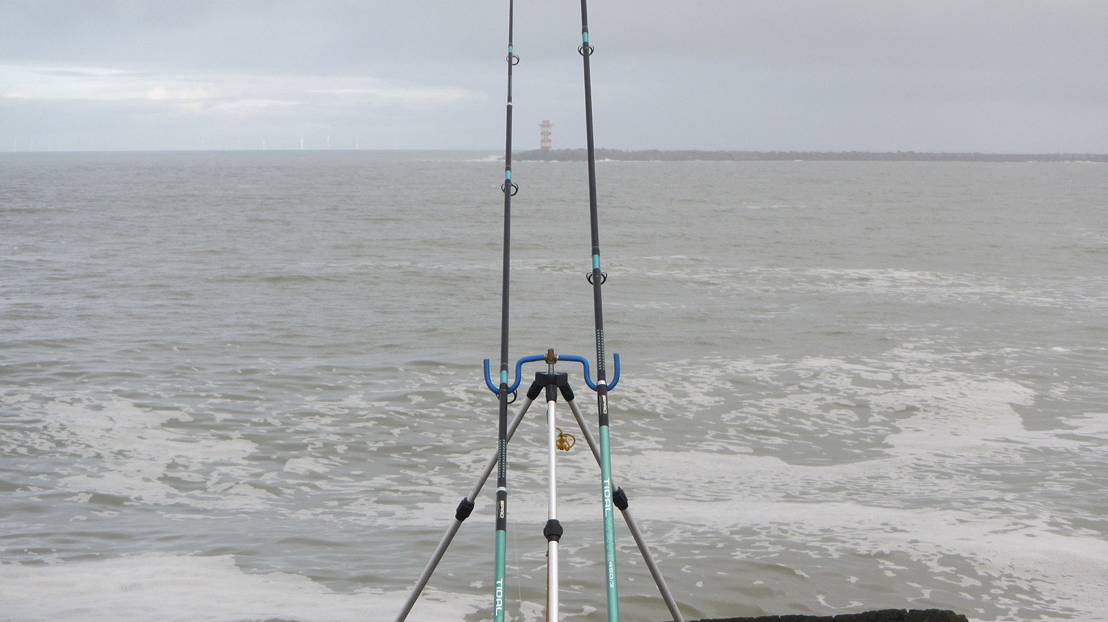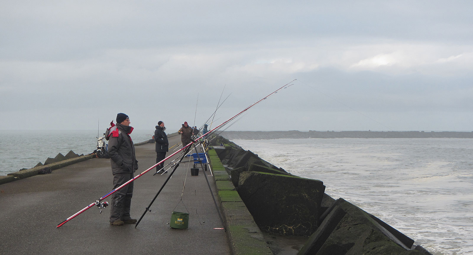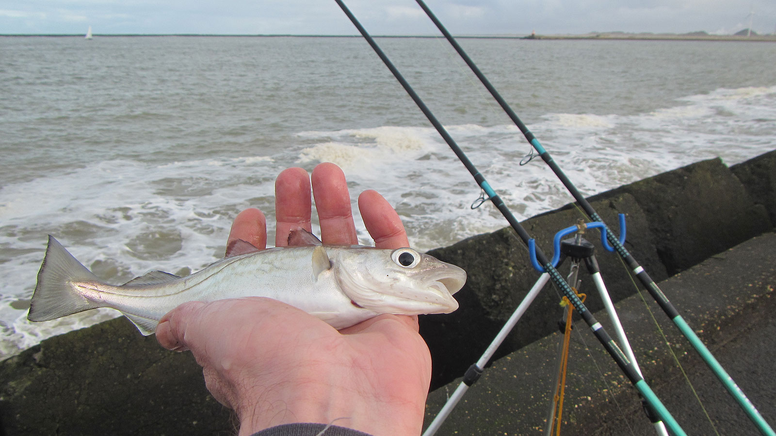 Er staat nog een mooie deining en het water aan de binnenkant is bruinig, een prima kleurtje voor de ‘geur’jagers. De gullenhengel krijgt aan twee haken een prachtige cocktail van zeepier, mesheft en tap. De andere krijgt onderlijnen met dunne afhouders of wapperlijnen, een zeepiertje en een stukje tap aan de haakjes.