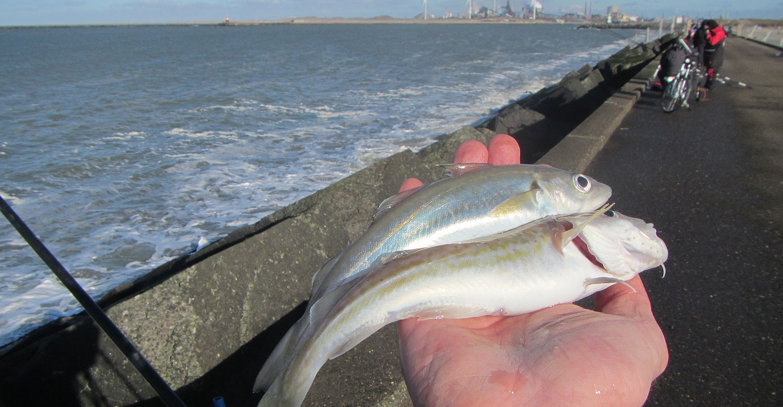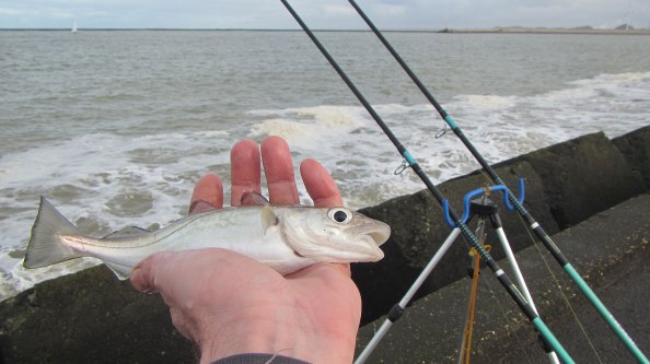 Het duurt een paar worpen maar dan komen de eerste visjes, een wijting en een bot. M’n directe buren, Jan, Harry, Arjen en Rene, hebben het ook niet druk. De rest kan ik niet in de gaten houden. Gestaag komt er een enkel visje boven. Onder de kant blijft het bij ons stil.