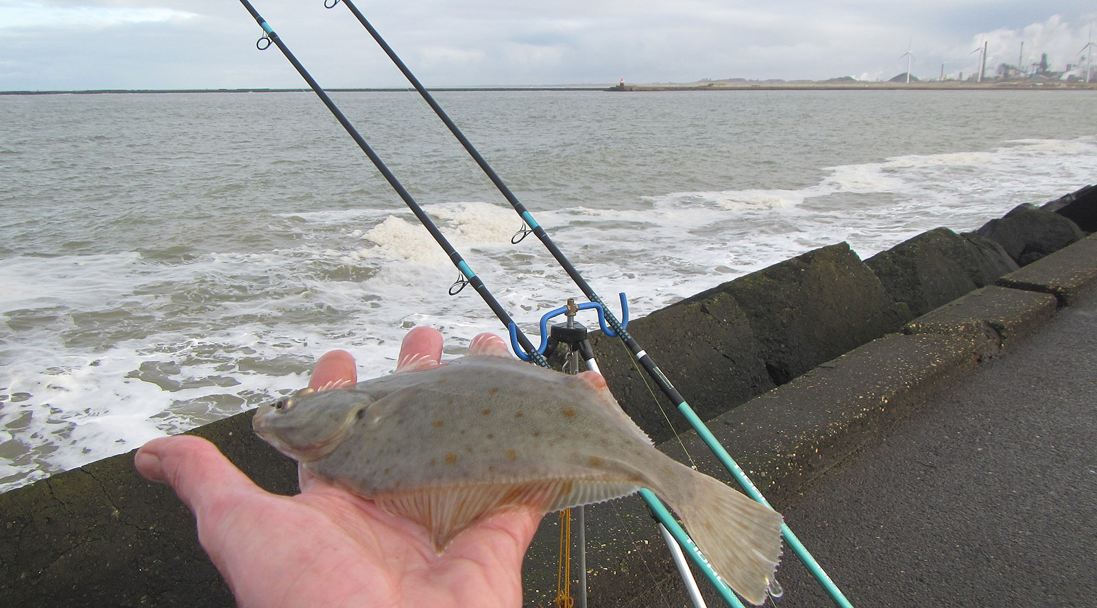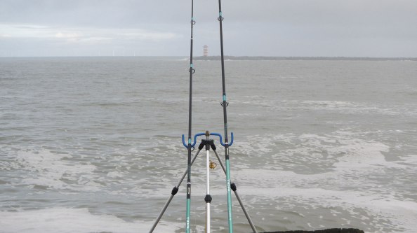 Dat wordt dus weer zoeken naar de mogelijkheden. Mijn begintactiek is dan ook de zelfde als vorige keer: één hengel onder de kant voor een gul en eentje op diverse afstanden verder weg voor platvis of wijting.