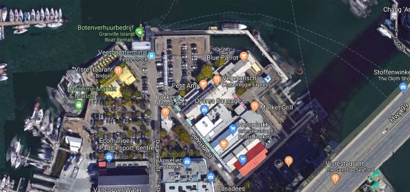 Je kunt namelijk op het roemruchte Granville Island bootjes huren en daar zelf -geen vaarbewijs nodig- mee de beschut gelegen monding van de Fraser River bevaren. Granville Island ligt midden in Vancouver en is een soort pretpark annex vreetschuur annex versmarkt annex shopping center annex deel van de haven.