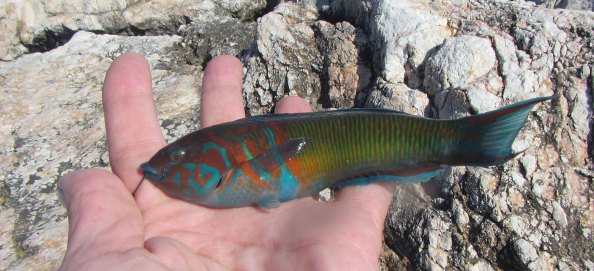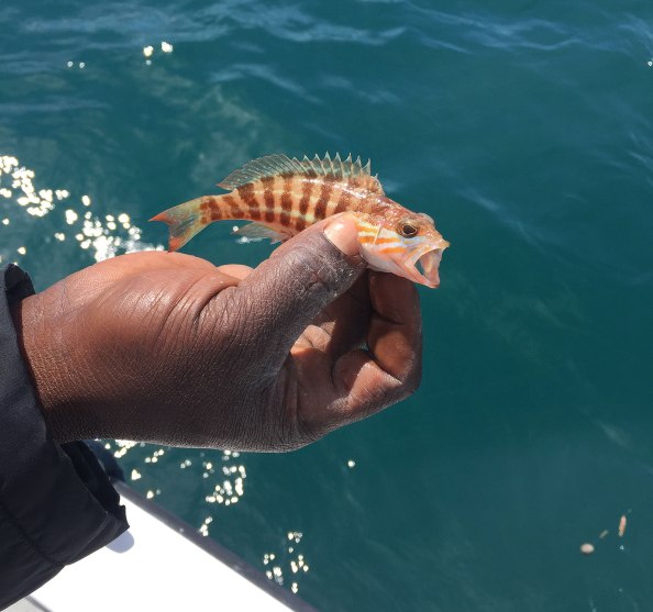 Het laatste uurtje ligt de boot boven een stuk bodem met rotsen. Er komt zowaar nog een andere soort boven, een zaagbaarsje. Maar dan zijn de vier uurtjes voorbij en dat was dan het bootvissen voor deze vakantie.