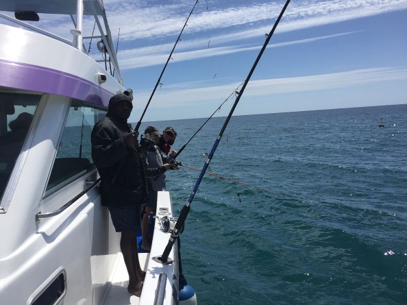 Helaas blijkt de boot niet erg ver de zee op te gaan en vooral het gebied in zicht van de haven te bevissen. De kapitein vaart wat heen en weer over de mosselbank, waar ook veel octopuskooien staan. Nouja, we moeten het er maar mee doen. Deckhand Victor komt uit Sierra Leone en blijkt een leuke kerel om mee te babbelen. De hengels aan boord zijn van bedenkelijke kwaliteit. Petra treft er een met zo weinig lijn op de molen dat de bodem niet kan worden gehaald. Jose heeft er eentje te pakken waarvan halverwege de dag de slinger van het molentje zich van de molen weet te ontdoen. Ik ben in ieder geval blij dat ik met m’n eigen spul kan vissen.