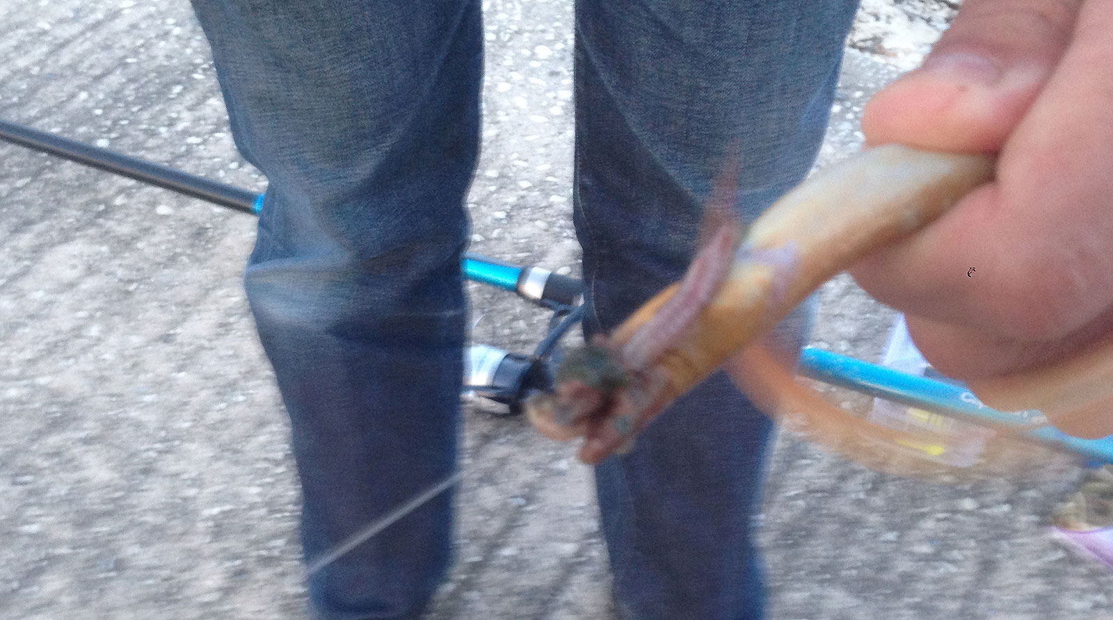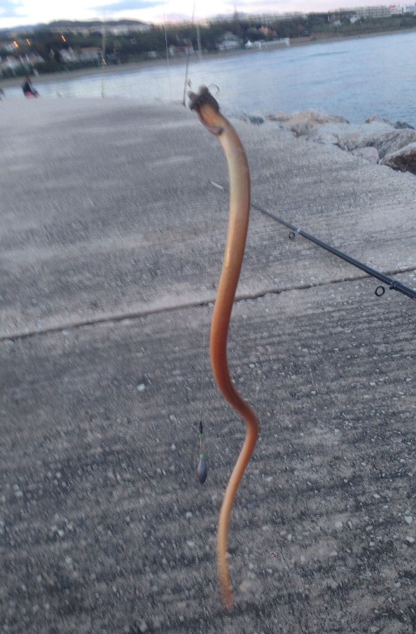 We blijven deze keer niet visloos. Zonder aanbeet te hebben gezien, blijkt er uiteindelijk een zeer dunne aalachtige vis aan de lijn te zitten. Het lijkt geen gewone paling te zijn, maar we denken dat het een jonge murene is die zich heeft vergrepen aan de zager, apart.