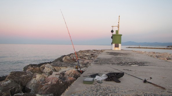 Er is nog een doosje koreaantjes over en de volgende ochtend sta ik weer bij zonsopgang op de pier. Deze keer vlak bij de kop met één hengel op de bodem met de wapperlijn en koreaantjes aan haak 4. Met de lichte hengel gooi ik tevergeefs een uurtje met diverse kunstaasjes, lepel, pilker, roofblei-spinnertje, waarna er een bombetta aan deze hengel komt -meteen maar met haakje 8.