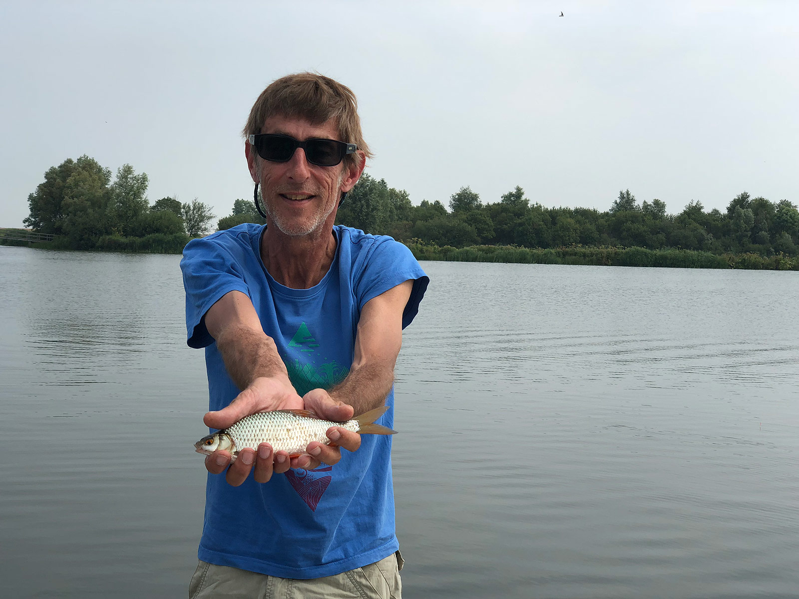 We hebben ook (sorry) geen onthaakmat bij ons. Ik heb de vis nog niet zachtjes (!) op de steiger gelegd of met één kopbeweging is de haak al los. Want ook deze blijkt buiten de bek gehaakt. Trotse Roel kan er mee op de foto.