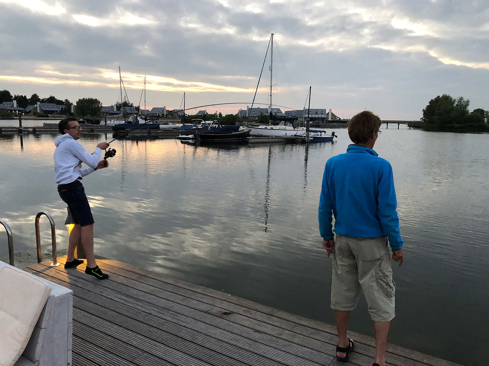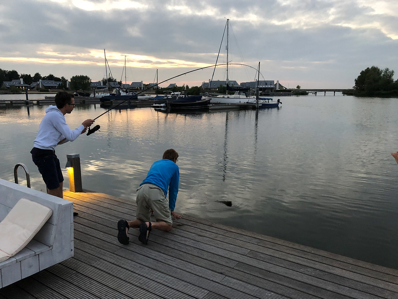 Er is geen schepnet meegekomen en we hebben al eerder de mogelijke landingsplekken voor de eventuele vangst besproken. De stenen aan de zijkanten van de steiger zijn instabiel, met een goede kans op narigheid. Het moet dus vanaf de steiger gebeuren.