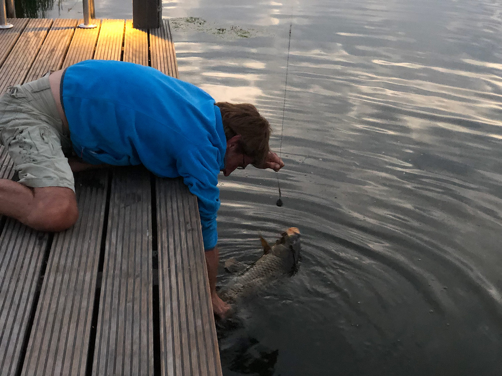 Roel krijgt de vis steeds dichter en hoger bij de steiger, de onderlijn komt boven water. Roel loopt wat naar achter en ik kan de onderlijn pakken. Gelukkig laat de bos waterplanten zich eenvoudig losmaken en de vis blijft vrij rustig kleine rondjes zwemmen zonder met de kop te schudden.