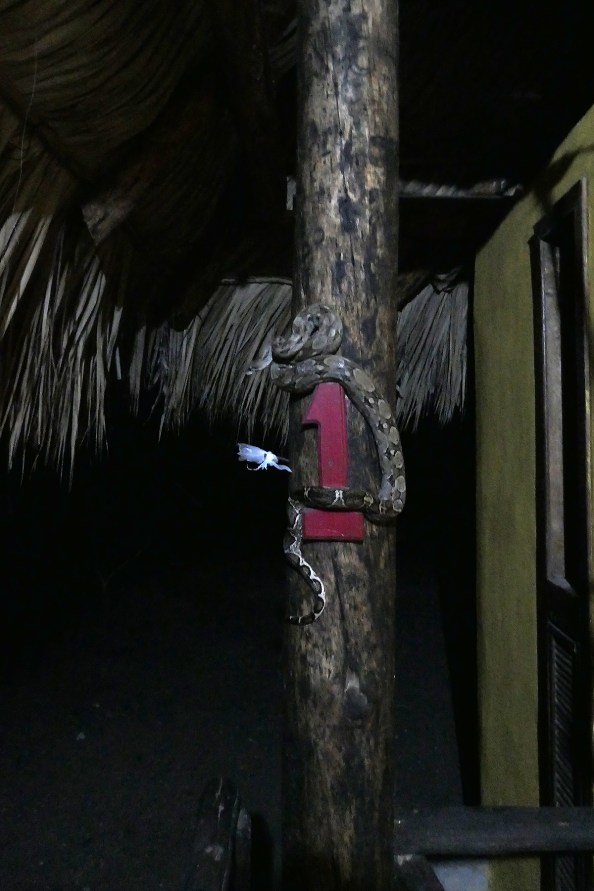 We krijgen trouwens die avond een bezoekje van een flinke slang die ons hutje een fijne plek leek te vinden. De avondwakers zijn zo vriendelijk deze, volgens hen, ongevaarlijke slang (want ‘hij eet vooral muizen en insecten’) zeer voorzichtig met een grote hark even een flink stukje verderop te begeleiden.