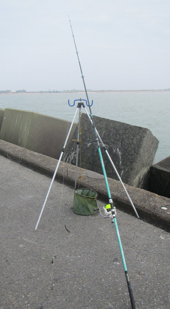 Het plan was met twee hengels te vissen, maar helaas bleek de feederhengel als tweede hengel in het foudraal te zitten. Omdat de stroming van het opkomende water nog stevig is, is de ene strandhengel met 150 gram ankers eigenlijk al voldoende. De feeder heeft niet in actie hoeven komen, ondanks dat de eerste worpen geen vis opleverden.